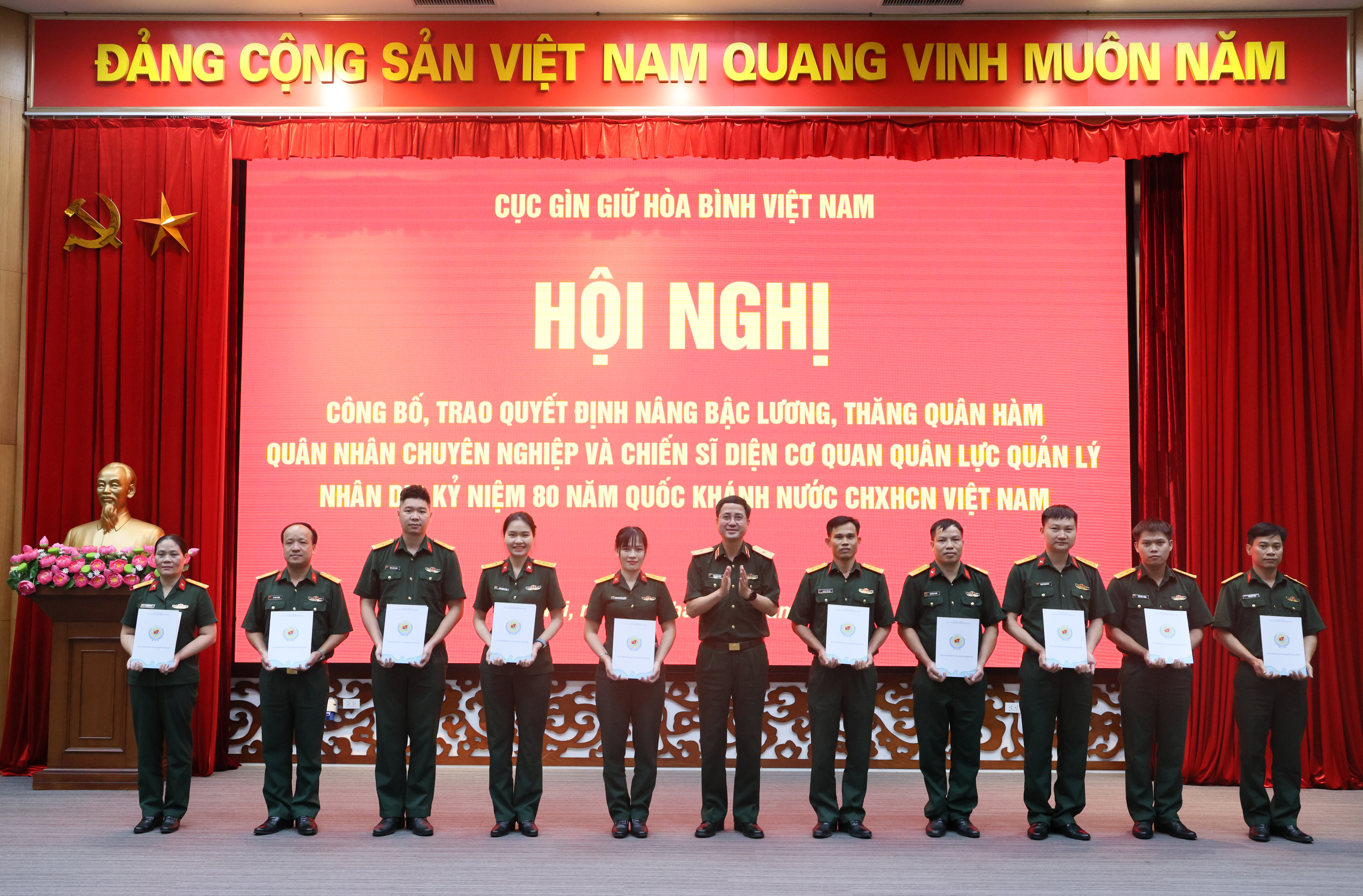 08/10/2025Chiều 3/10, Cục Gìn giữ hòa bình (GGHB) Việt Nam tổ chức Hội nghị trao Quyết định nâng lương, thăng quân hàm, thưởng hệ số bảo lưu và phụ cấp quân hàm cho các quân nhân chuyên nghiệp (QNCN) và hạ sĩ quan, binh sĩ (HSQ-BS) nhân dịp kỷ niệm 80 năm Quốc khánh nước CHXHCN Việt Nam (2/9/1945 – 2/9/2025).