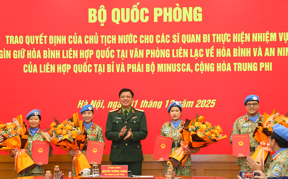 31/12/2025Sáng 31/12, tại Hà Nội, Bộ Quốc phòng tổ chức Lễ trao quyết định của Chủ tịch nước cho 04 sĩ quan Quân đội nhân dân Việt Nam đi thực hiện nhiệm vụ Gìn giữ hòa bình Liên hợp quốc.